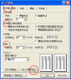 ●[新規作成]→[ページ設定]でページ設定画面が表示されます。ここで縦書き、横書きの選択、ページ組の段数を選択します。(図2)次に[フォントの設定]をクリック、[フォント](図3)へ進みます。フォントとサイズ余白を設定すると(図2)の文字数、字送り、行数、行送りが仮設定されます。文字数、字送り、行数、行送りの数値は後から変更できます。